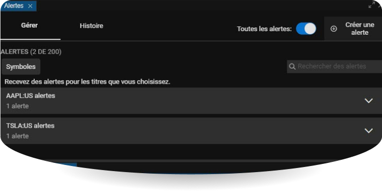 Personnalisez facilement les alertes tout en gardant votre liste de surveillance ouverte, pour ne rater aucune occasion importante.